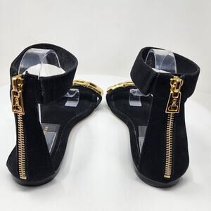 Good American Ankle Wrap Sandals Women 9 Black Suede w/ Gold Chain Detail Heel Zip Square Toe