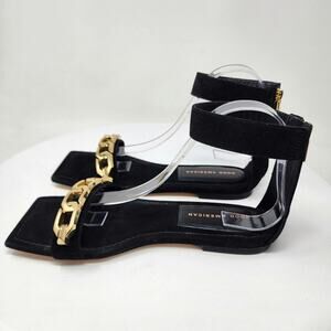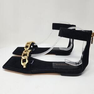 Good American Ankle Wrap Sandals Women 9 Black Suede w/ Gold Chain Detail EUC
