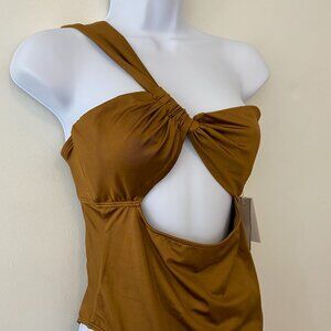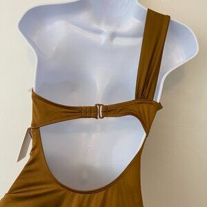 Bronze one piece one shoulder swimsuit with cut out at stomach