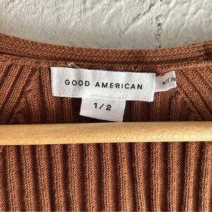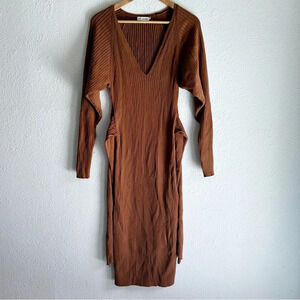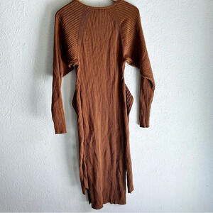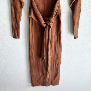 Good American Belted Long Sleeve Ribbed Bodycon Dress Midi Brown Sz 1/2