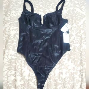 Sleek black bodysuit. Deep neckline. Perfect for layering. Runs large. New with tags.