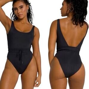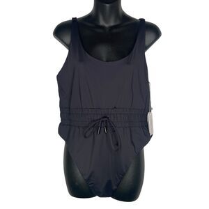 This classic tank suit features a flattering cinched waist with tie closure in a minimalist black. Brand NEW with tags, never worn.