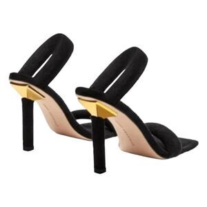 Good American Black French Terry Ankle Wrap Heel is perfect for summer nights. The have a Vamp Strap, Square Toe Bed, Leather Padded Foot Bed, Open Peep Toe and an amazing Gold Accent Kickstand Heel. New in box, comes with dust bag.