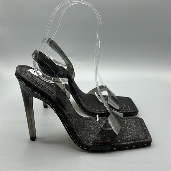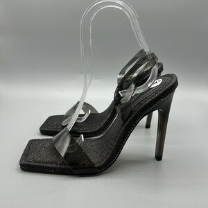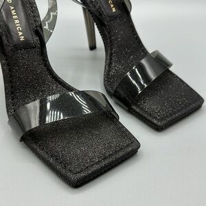 Good American Black Glitter Jeweled Strappy High Heels Square Toe Women's Size 7