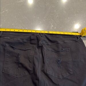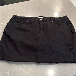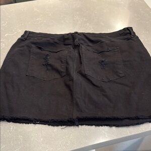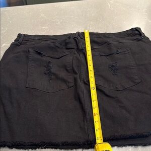 Trendy black mini skirt with distressed details. Perfect for casual or night out. Stylish and edgy design.