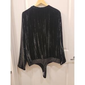 Long sleeve one piece black bodysuit in soft velvet fabric with V neckline, thong snap closure with lining in tact.