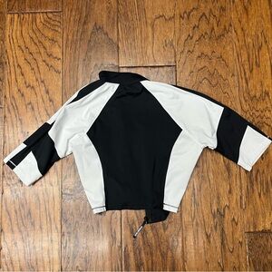 This cropped jacket features a striking color-blocked design with a black main body and contrasting white panels on the sleeves and sides. It has a short boxy cut and a crew neckline, making it perfect for a sporty casual look.