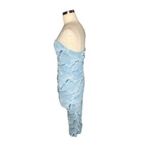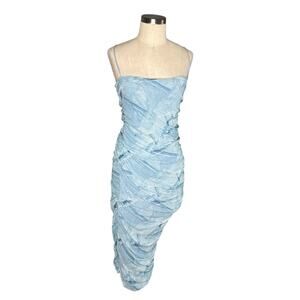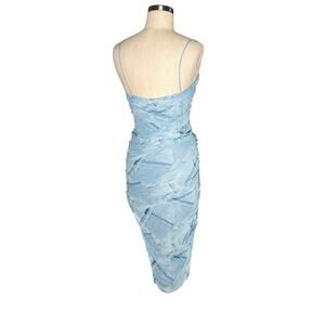 Elegant blue midi dress. Features a fitted silhouette. Spaghetti straps for a chic look.