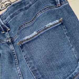 These Good American skinny jeans feature a classic blue wash with a stylish distressed hem, offering a modern twist to a timeless look. The denim is soft and comfortable, with natural fading and whiskering that adds character and charm. Perfect for any casual outing, these jeans provide a flattering fit and versatile style.
