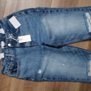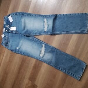 Classic straight leg jeans. Distressed details on knees. Comfortable fit. Perfect for casual wear. Tag says size 14/32, but is mislabeled. Fits like a 10 or 12, no stretch.