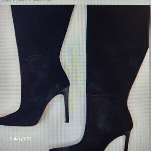Good American Boots Black Suede Thigh High Ultra Heel New in box These have a satin detail on the front of the toe and the heel. Very high end detail. Heel height- 4in Women's 6. THESE RUN 1/2 size small GA173K-X Shaft Height 30.5" Width 8.5" Comes with dust bag Please see the photos for more details Smoke free home