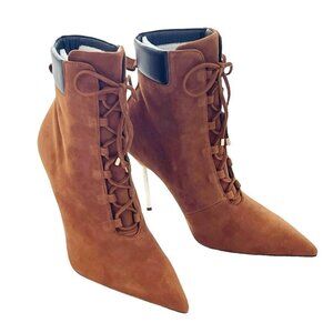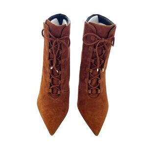 Good American "Scandal" Tobacco Suede Booties. Lace up front, 2.5” gold stiletto heels. Booties are a woman's size 8 and are brand new in box. Org. list price $275. Made in Spain.