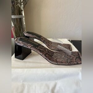 Stylish snake print sandals. Features clear strap. Perfect for any occasion.