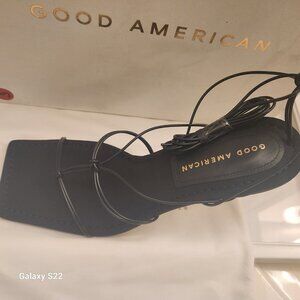 Good American Cage Slanted Neoprene Slanted Sandals/Lace Up. NIB (not price tag). Size Various. No rips/stains or tears. Original box/packaging, includes dust bag. Smoke free home. No odors. All offers are welcome. Thank you! Box has some dirt markings/nothing major. Recommendation is going one half size bigger, this brand runs small. The pic shows the 8.5, but I have a 7.5 also.