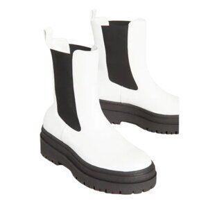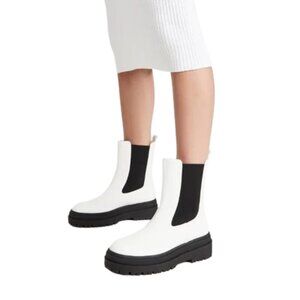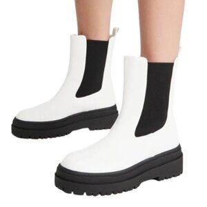 A bold, timeless accompaniment for jeans and dresses alike, these two-tone Good American boots have a combat-inspired chelsea silhouette and a substantial lug sole.