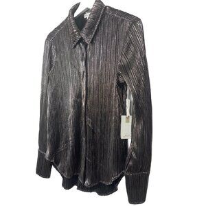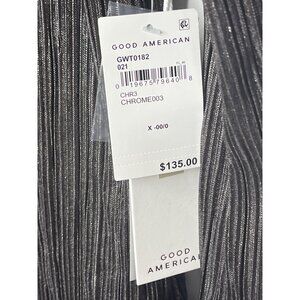Elevate your look with this Good American women’s button-up shirt in a stunning chrome metallic lamé. Crafted with a plissé pleated texture, this lightweight top drapes effortlessly and catches the light for an eye-catching finish. Features a collared neckline, button front, and long sleeves — perfect for pairing with trousers, skirts, or denim for a night out, holiday party, or elevated daywear. Designed in a relaxed silhouette that flatters and feels comfortable, this top transitions seamlessly from work to evening. Size XS / XXS (00).