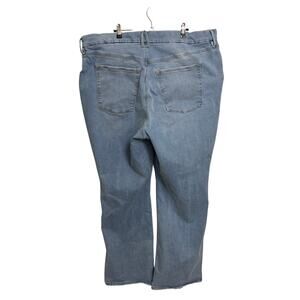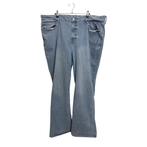 Good American Good Classic Bootcut Jeans in a light blue indigo wash with high-rise fit and bootcut leg. Features stretch denim construction with 93% Cotton, 5% T400 Polyester, and 2% LYCRA Spandex for comfort and movement. Classic 5-pocket styling with button and zip fly closure. Good pre-owned condition.