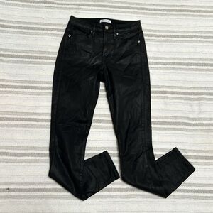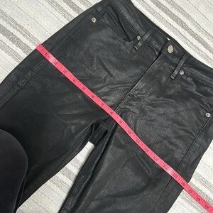 good american coated jeans womens 24 black faux leather look slim straight high rise pants glossy sheen breathable cotton blend stretchy comfortable sleek night out streetwear quiet luxury downtown cool elevated casual fall winter wardrobe essential model off duty look