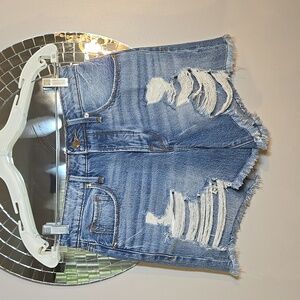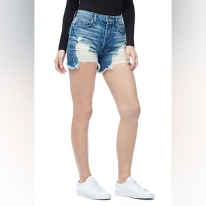 Cut off short. High rise. Medium wash denim. Ripped with destruction down legs. Raw edge hem detailing. 4" inseam