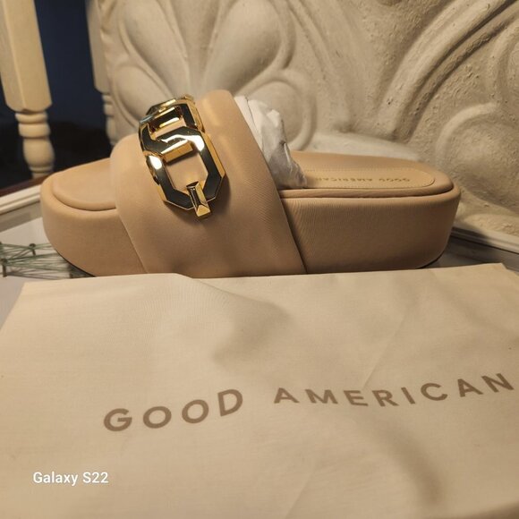 Good American Cream Platform Slides. NIB. Size 6.5. Comes with dust bag. No rips/stains or tears. Smoke free home. No odors. All offers are welcome. Thank you!