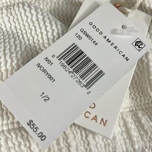 Here is a Good American Crinkle Scoop Bra Bathing Suit Top Size 1/2 NWT, color is ivory