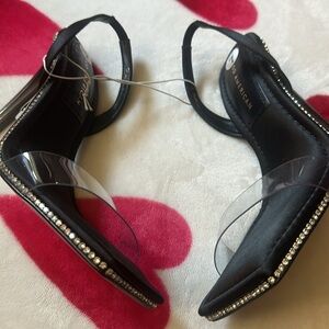 Glittering rhinestone accents complete the look of this strappy sandal with a clear vamp strap and Lucite stiletto heel that's ready for a glam night out.