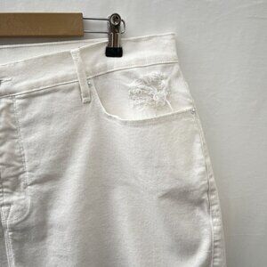 Crafted with quality denim, these stylish high-rise white shorts feature distressed detailing and a raw hem, offering a modern, versatile wardrobe addition.