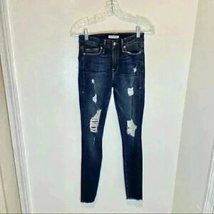 Description: High rise skinny jeans with distressing and raw hem. Button and zip fly. Five pockets.