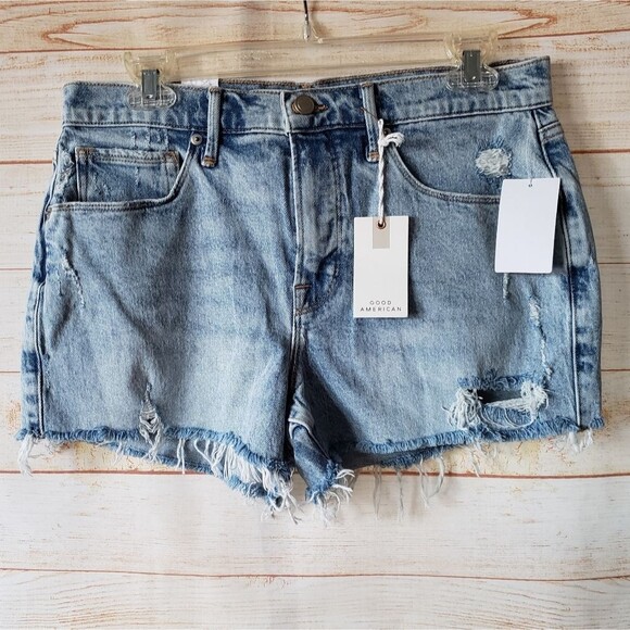 Good American Distressed Frayed Denim Jean 5-Pocket Shorts in Indigo155