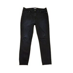 Dark rinse stonewashed skinny jeans. High-waisted. Single button and zipper front closure. Distressed detail. Open ripped knees. Matching threading. Five pockets.