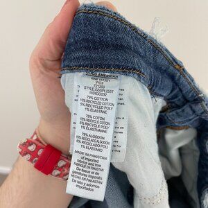 Features: zip fly with button closure, high rise, straight leg, five pocket style, split back pockets, reinforced belt loops, gap-proof waistband, raw hem, cotton blend