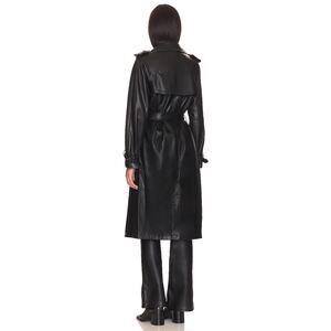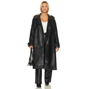 The Good American Faux Leather Trench Coat in black features a sleek, double-breasted design with a belted waist for a flattering fit. Its glossy faux leather finish adds a bold, modern edge to the classic trench silhouette, making it a standout piece for any wardrobe.