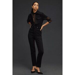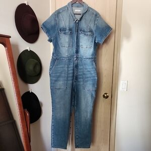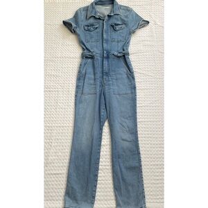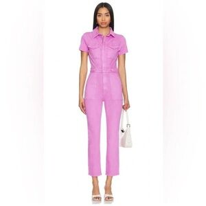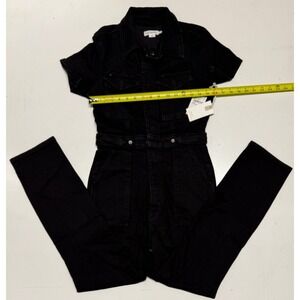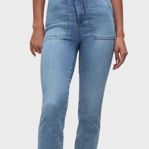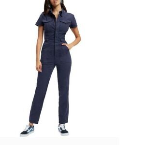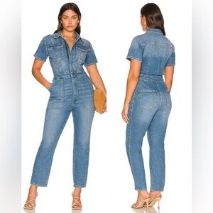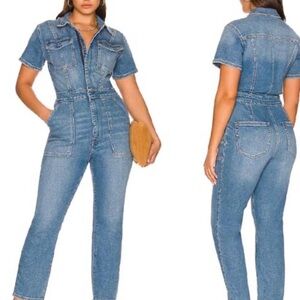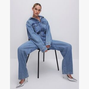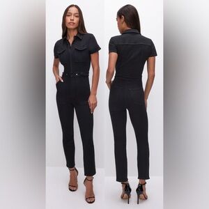 New with tags Good American Fit For Success straight leg denim jumpsuit in fatigue green. This structured yet comfortable jumpsuit features a hidden front zip closure, point collar, short sleeves, and functional snap-flap chest pockets with front and back patch pockets. Designed with a flattering straight leg silhouette and adjustable waist snaps for a customized fit.