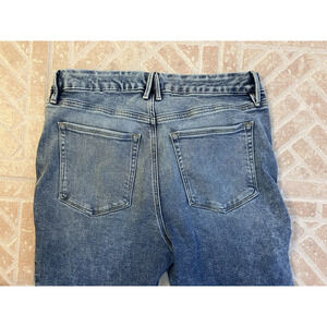 Good American Good Legs Straight Jeans in size 14, featuring a mid-rise fit, 5-pocket design, and made of denim with a cotton blend fabric. The jeans come in an indigo blue color with a medium fabric wash. They have a button and zipper closure, a 29-inch inseam, and offer a slimming, shaping, and comfortable fit with stretch. The style is straight and suitable for various seasons and occasions.