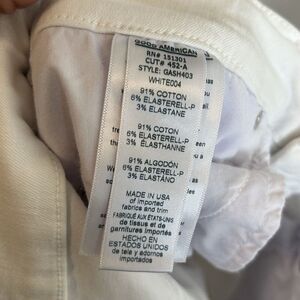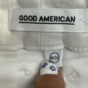 Up for sale is a pair of stylish Good American Gash403 white cut-off shorts in size 15/33. These shorts are perfect for travel or casual occasions, with a solid pattern and button closure. The high waist rise adds a touch of elegance to the design.