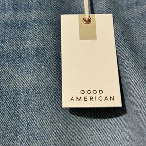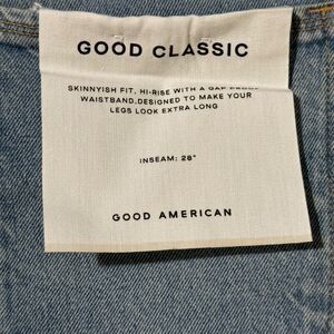 These Good American Good Classic jeans feature a hi-rise, skinnyish fit with a gap-proof waistband for comfort and flattering wear. The distressed blue denim adds a stylish, worn-in look, perfect for casual outings or dressing up with heels and a blouse.