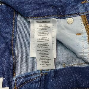Fantastic jeans from Good American! Features high rise waist, zipper fly, skinny leg silhouette named 'Good Classic', distress details on the front of the legs, full length inseam, and medium blue wash named 'Indigo207'.