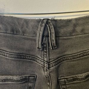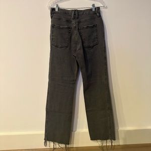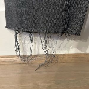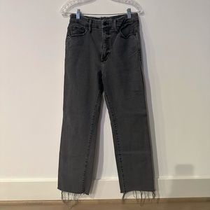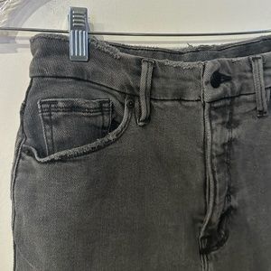 These jeans are a great staple pair! The material is super comfortable and stretchy, and the color is a solid neutral. The criss-cross shape of the belt loop means that the jeans fit on the waist with no gap. There is a raw hem on the bottom for an added detail. The jeans have a button closure with a zip fly as well as four pockets.