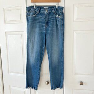 Good American “Good Curve Straight” jeans in a classic medium blue wash. These flattering high-rise jeans feature a straight-leg silhouette with raw hems and light fading for a lived-in look. Crafted from a soft, stretchy cotton-Lyocell blend that enhances comfort and shape retention. Effortlessly chic and versatile — pair them with heels or sneakers for everyday wear.
