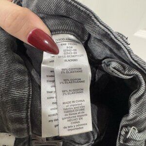 These Good American Good Curve Yoke Skinny Jeans are crafted from a comfortable cotton blend fabric with a charcoal wash finish. Featuring a high-rise silhouette with a slim fit and a 28-inch inseam, these black jeans are designed for women in size 0. The classic 5-pocket design, button and zipper accents, along with belt loops and a leg opening of 10 inches, make them a versatile choice for any season. With a modern American designer theme, these jeans from the Good American product line offer both style and comfort for everyday wear.