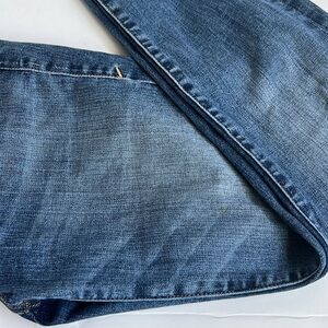 Good American Good Legs Blue 187 skinny jeans w some distressing and fading and intentionally ripped back pockets.