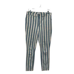 Stylish cropped skinny jeans with bold blue and white stripes. Soft and stretchy fabric ensures comfort and a flattering fit.