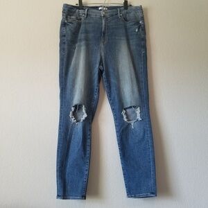 Measures approximately 40" long, 28" inseam, 13" front rise 18.5" flat across waist, 22" flat across hips. Distressed; large holes at knees. New without tags.