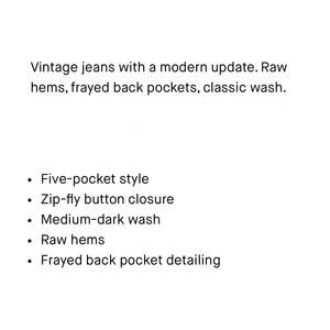 Soft and stretchy blend of 99% cotton 1% elastane in a medium blue wash with factory fade and whiskering. Frayed edges throughout including the back pockets.