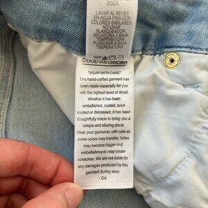 High waist skinny jean, distressed near front pocket and a spot in the back (see pic), very soft, lighter weight jean, loads of stretch, unique shiny gold hardware