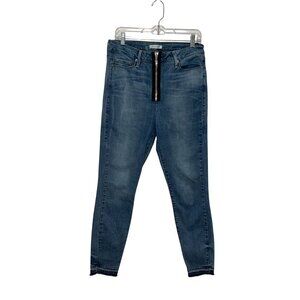 Stylish high-rise skinny jeans featuring a unique front zip detail and lightly distressed hem. Designed for comfort and versatility in a flattering medium wash.