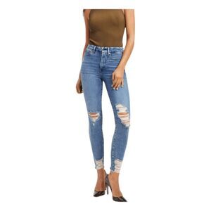Good American Good Waist Skinny Distressed Released Chewed Hem Jeans in a Blue Medium Wash Stretch Denim. Their skinniest cropped jeans designed to enhance your natural silhouette with a super high-rise that nips at the waist for a sexy snatched shape. They are a High Rise Skinny Leg Body Hugging Cropped Leg and Booty Shaping, high recovery denim for all day support.