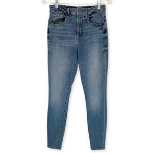 Waist nipping skinny high rise jean with flat tummy tech and a gap-proof waistband. Classic skinny jeans that are comfortable and flattering. A closet staple for any season. Medium wash with wiskering, clean hem, full length, zipper fly and distressing at the back of each ankle.