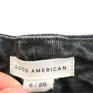 Good American's Classic Raw Hem High Rise Slim Jeans in black are a flattering choice for women. The slimming features and ankle style make them a versatile addition to any wardrobe. These jeans are available in size 6 with a 28-inch waist and are made from high-quality fabric.