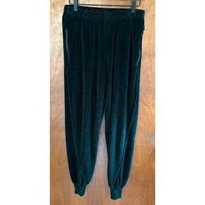 Great pair of Good American emerald green velour or velvet twisted seam high rise jogger pants in a size 2, which equals a sized medium. They feature a high waist that's stretchy elastic, a pull on construction, banded cuffs, side zip pockets, a relaxed slouchy baggy fit, & a cotton blend. As seen in the photos, there is a small mark in the velvet on the front.